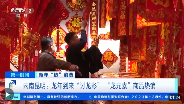 云南昆明的一个商贸城内,记者看到各种充满着年味的商品琳琅满目。2024年,“龙元素”成为年货市场的主角。