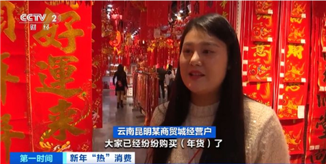 云南昆明某商贸城经营户:从上个月开始,人们就已经开始购买年货。灯笼、福字、对联,还有窗花、摆件都是最热销的产品。采购高峰期从这个月开始,批发商已经开始补货,一直会持续到腊月二十八左右。