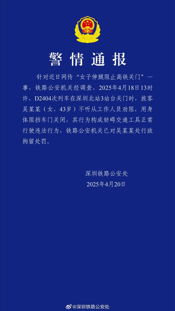 警方通报女子阻止高铁关门:伸腿阻止高铁关门女子被拘留