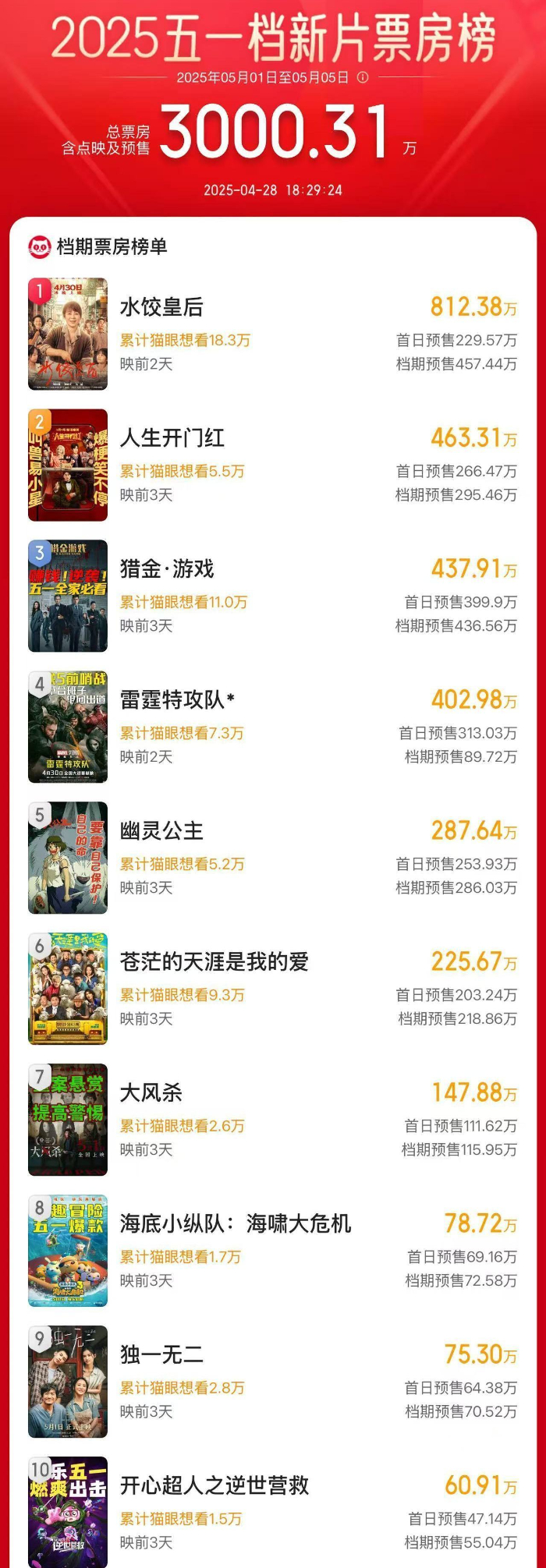 据网络平台数据,截至4月28日18时29分,2025年“五一”档新片预售总票房破3000万,《水饺皇后》《人生开门红》《猎金·游戏》分列前三位。