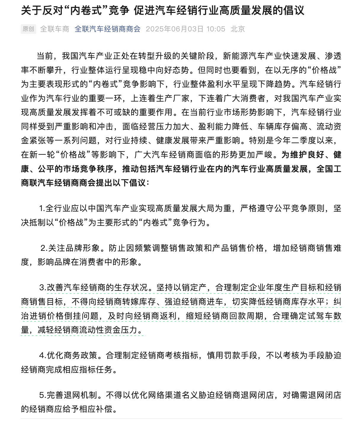 6月3日,全国工商联汽车经销商商会发布《关于反对“内卷式”竞争 促进汽车经销行业高质量发展的倡议》。