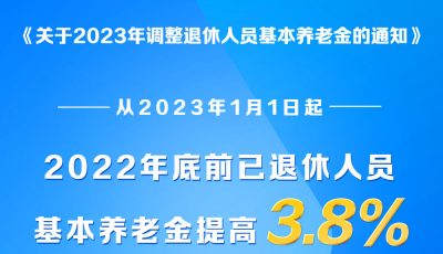 人社部、财政部22日发布 《关于2023年调整退休人员基本养老金的通知》 明确从2023年1月1日起 为2022年底前已...