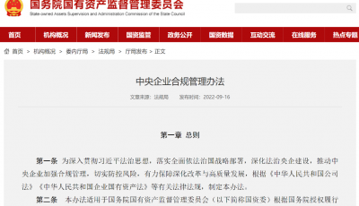 国务院国资委日前印发《中央企业合规管理办法》,推动中央企业加强合规管理,切实防控风险,有力保障深化改革与高质量发展。办法...